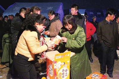 11月2日,在乾安县瑟字村,灾区群众正在领取方便面等食品。10月31日,松原市前郭县5.5级地震发生后,省及松原市领导第一时间赶到灾区,积极协调指挥抗震救灾。截至目前,震灾中心周边4900多户村民全部住进搭建的简易帐篷中,当地群众正在恢复正常的生产生活。