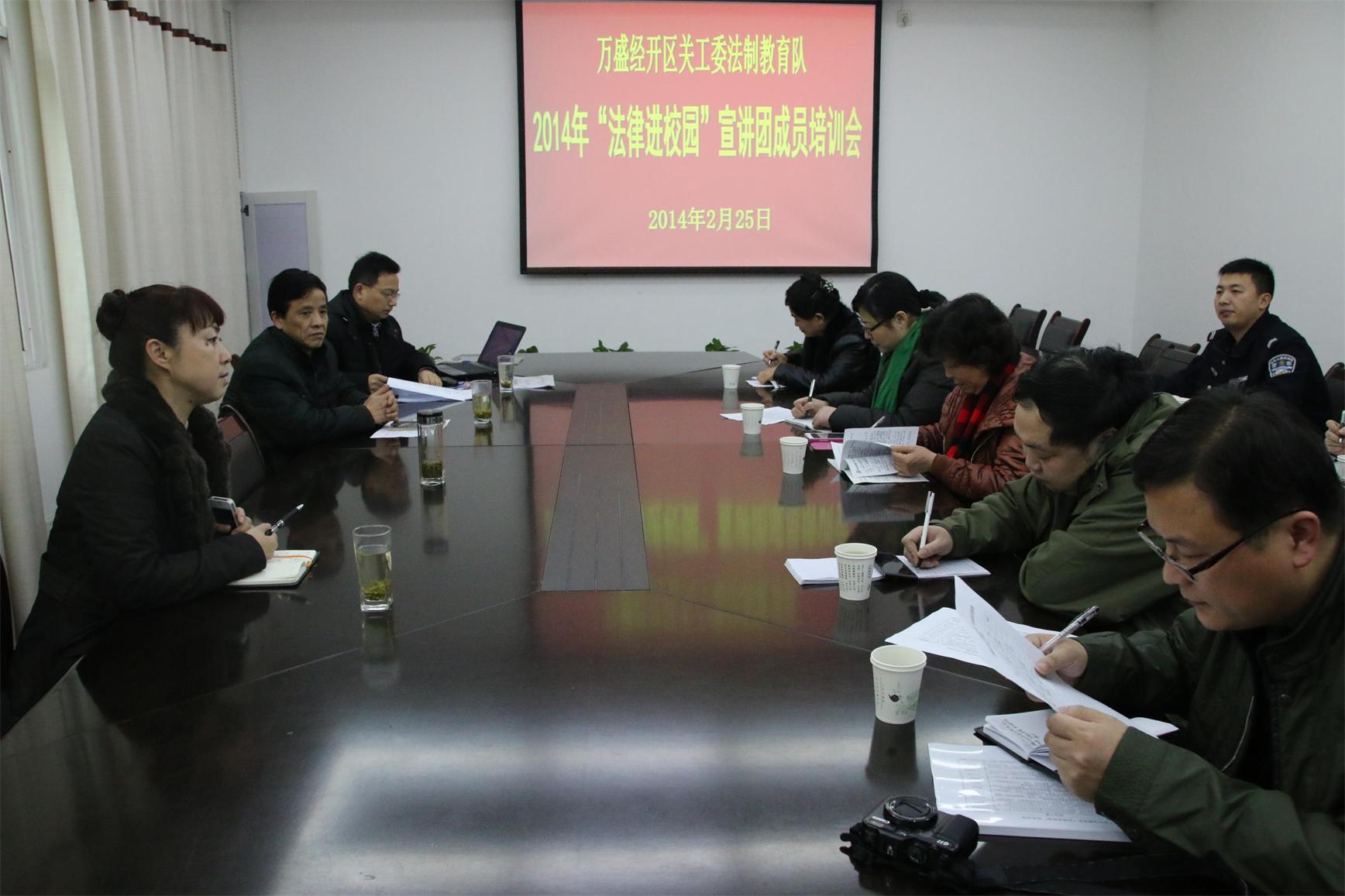 2月25日,万盛经开区关工委法制教育队2014年“法律进校园”宣讲团培训会在区教育局二会议室举行,法律教育队副队长贺卫凯主持会议,区关工委常务副主任犹春香、杨传华及宣讲团成员10余人参加了培训会。