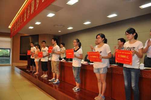 8月19日,金华市关工委、市民政局、市福彩中心、市慈善总会、金华日报社、金华广播电视总台联合开展的“福彩牵手、慈善助梦”2014贫困学生资助仪式在市文化中心举行。本次活动共向全市100名品学兼优的贫困大学新生发放助学金50万元,向66名贫困中小学生发放助学金10万元。