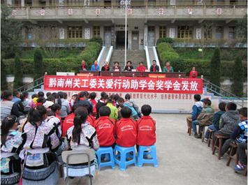 11月3日,黔南州关工委常务副主任孔繁英、秘书长胡明、兰鑫石墨机电有限公司董事长杨颖、福泉市华祥茶叶有限公司董事长王华祥到福泉市苗乡——仙桥乡开展“关爱行动”活动。举行“关爱行动助学金、奖学金”仪式,为仙桥110名中小学生送去助学金、奖学金叁万玖仟元。福泉市关工委常务副主任宋雅琴,副主任谢建菊,办公室主任肖袖钰,仙桥乡党委书记雷世娟参加了发放仪式。
