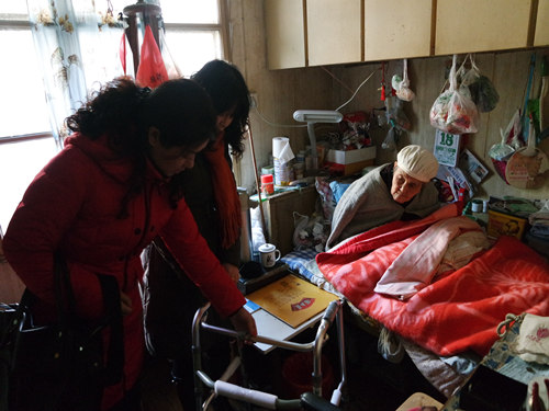 1月19日,安徽省安庆市迎江区天后宫社区顶着寒风来到辖区曹家巷东2栋2单元303室空巢老人方林家中,为她送去妇联免费发放的爱心助行器。