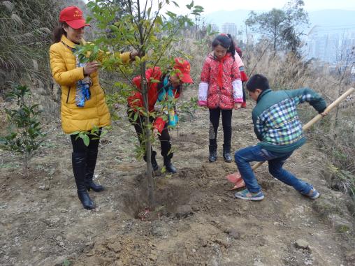 当天,经过大家精心栽植和辛勤劳动,在不到半天时间,大家就在一片荒地上栽种了近30株桂花树苗,给大地增添了绿色的希望。