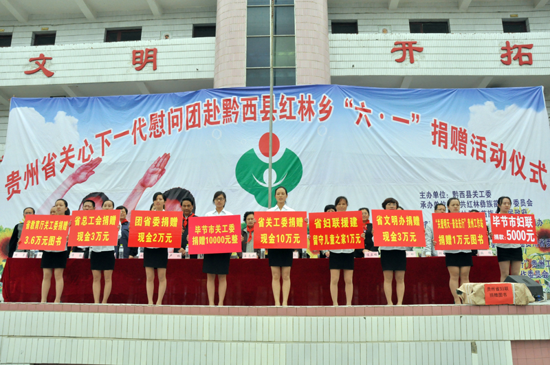 5月29日,在“六一”国际儿童节即将来临之际,为让孩子们欢度一个愉快的节日,省关工委、省文明办、省总工会、省妇联、省教育厅关工委、中国关工委全国普法教育活动办贵州工作站组成省关心下一代慰问团赴毕节市黔西县红林彝族苗族乡开展“六一”慰问捐赠活动。省关工委及省直有关单位负责人,毕节市关工委,黔西县委、县政府、县关工委和有关部门负责人参加活动。