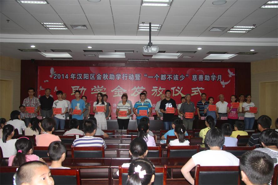 为了帮助困难家庭青少年解决上学难的问题,同时也充分体现党和政府对青少年、下一代的关爱。8月27日上午,区关工委、区慈善会、区总工会、团区委、区妇联、区残联、区工商联等联合举行2014年汉阳区金秋助学行动暨“一个都不该少”慈善助学月助学金发放仪式,部分大学生代表和60户困难单亲家庭青少年参加仪式,并现场获得了2000元和500元的助学金。区委副书记、区委政法委书记盛继亮出席发放仪式并讲话,区关工委领导张志成、傅明举、李循江、陈树东、段华钦参加发放。
