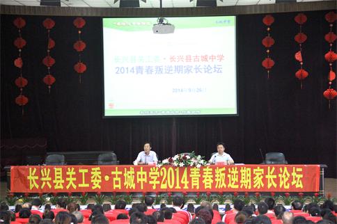 2014年9月26日,浙江省长兴县关工委主办、长兴县教育局关工委、长兴县古城中学承办的青春叛逆期家长论坛,在长兴县古城中学报告厅举行。长兴县关工委讲师团部分成员、市县关工委领导、各乡镇(街道)关工委常务副主任以及古城中学七年级600多名家参加了本次论坛。