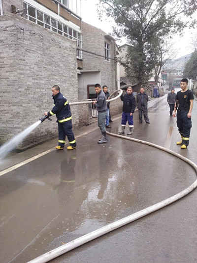 2月17日,万盛武警消防中队来到万东镇五里村为当地群众冲洗出行公路。