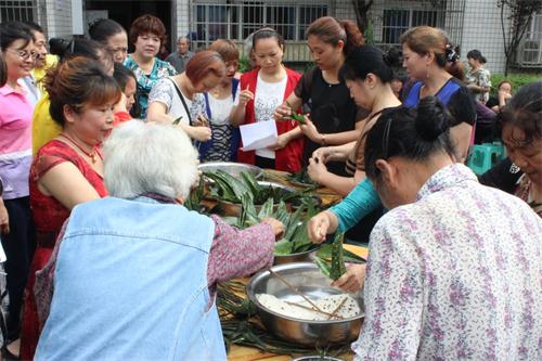 活动现场,糯米、粽叶、红豆等多种材料整齐地摆上桌。社区爱包粽子的“巧手们”积极的参加包粽子比赛,选手们分成4组,每组5人,有的包的是三角粽子,有的包的是尖头粽子,有的包的是五角粽子,大小不一,形态各异。最终社区居民王阿姨在10分钟内包好了22个粽子,成为包粽子的冠军。随后,5名青年志愿者将包好的粽子和菖蒲陈艾分别送给了辖区内的空巢老人,让浓浓的粽香伴着爱心,温暖他们的心田。“吃粽子啰......”新鲜出锅的粽子让社区的小广场到处弥漫着粽子的清香。台上,有舞蹈荷塘月色、小品过马路等精彩节目,台下,居民们吃着满口生香的粽子,笑声朗朗。