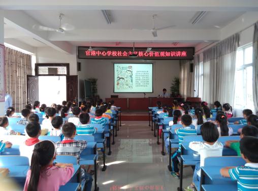 为培育广大青少年社会主义核心价值观,连日来,东至县官港镇关工委深入该镇中小学开展社会主义核心价值观主题教育宣传活动。该镇人大副主席、关工委主任张登会围绕“24字社会主义核心价值观”基本内容搜集有关文字、图片、漫画、歌曲和视频制成课件通过屏幕边展示边讲解,向广大中小学生宣讲了社会主义核心价值观3个层面24字12个方面的丰富内涵。课件短小精悍,内容丰富,融知识性、科普性和趣味性于一体,达到了宣传教育目的,取得了良好成效,受到了师生们的欢迎。