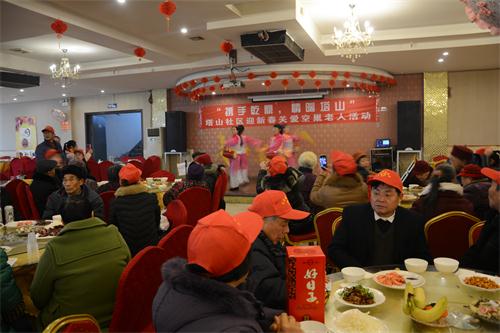 当天上午11点,在爱心企业乾鼎酒楼内灯笼高挂,热闹非凡,社区志愿者为空巢老人们送上了一台精彩的节目,有老人们喜爱的各类舞蹈和独唱,有为老人们开通与子女的视频对话环节,使在场的老人们十分感动。12点过,酒楼又为老人们准备了热气腾腾的年饭,席间,社区志愿者们不停地为老人们夹着菜,好一幅其乐融融的味道。
