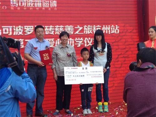 广东马可波罗陶瓷有限公司事业部副总经理秦瑞福先生和马可波罗瓷砖慈善基金秘书长李军林先生共同为上城区78位家庭经济困难的学生颁发了助学金共计3.9万元,并勉励他们好好学习,回报社会。区关工委常务副主任邵美英向广东马可波罗陶瓷有限公司、杭州香洲实业有限公司颁发了捐赠证书,并期望能够借此爱心活动,呼吁更多的企业能参与到捐资助学的活动中来。