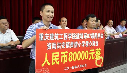 他代表重庆建筑工程学院建筑系87级同学,向贵措小学捐赠8万元教育善款,帮扶贵措小学的孩子添置学习用品。