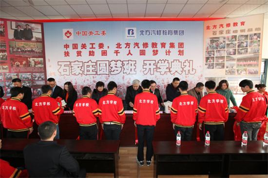 2014年11月18日,“扶贫助困千人圆梦计划”石家庄圆梦班开学典礼在石家庄北方汽修学校举行。河北省关工委常务副主任杨新农,中国关工委办公室主任陈江旗,河北省关心下一代基金会秘书长邴建华,中国关工委办公室联络处副处长郎亚龙及北方汽修教育集团有关领导出席了开学典礼。31名圆梦班的学员参加了典礼。