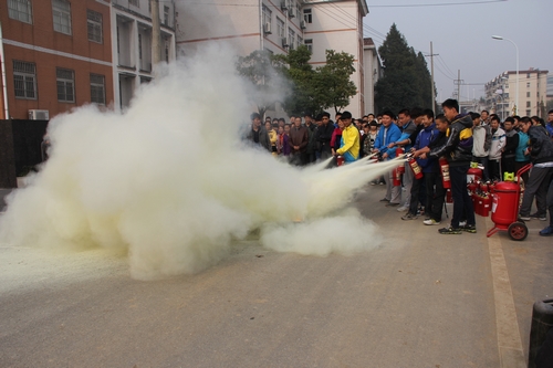 演练现场42具干粉灭火器摆放有序,张经理现场给大家讲解了灭火器的使用要点及注意事项。一声令下,火盆的大火熊熊,参演学生手提灭火器勇敢地冲上去,刹那间火场烟雾弥漫,火光烟雾中闪现奋力扑灭的矫健身影。