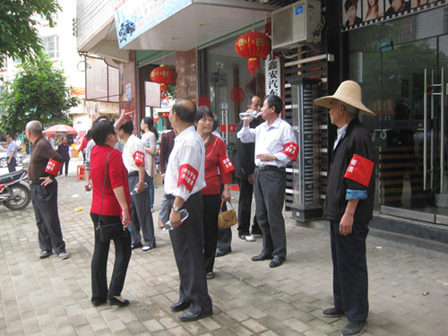 为激励广大离退休干部更好地为我县改革发展大局凝聚正能量,今年,在全县离退休干部中深入开展“展示阳光心态、体验美好生活、畅谈发展变化”主题活动,并成立了退休干部志愿者服务队。2015年4月30日,退休干部志愿者服务队走上街头,对乱停乱放、乱摆摊设点、乱倒垃圾等行为进行劝导,帮助店户整齐有序摆放物品,维护整齐畅通的街道环境,体现了老干部无私奉献的精神和阳光的心态。