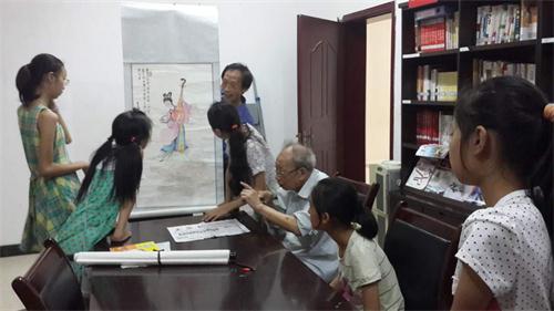 7月1日下午,八0一社区酷爱书画的儿童早早的就来到了“杜老师工作室”,来学习书画。这天,“五老” 志愿者王廷耀老师为学生们带来了自己亲手创作的几幅诗画作品。几名儿童被王老师色彩鲜明的作品深深地吸引了,一双双小眼睛目不转睛的盯着画,看得津津有味,几位老师则在一旁耐心细致地为他们讲解着。欣赏完作品后,王老师还教学生们动笔试着自己画。