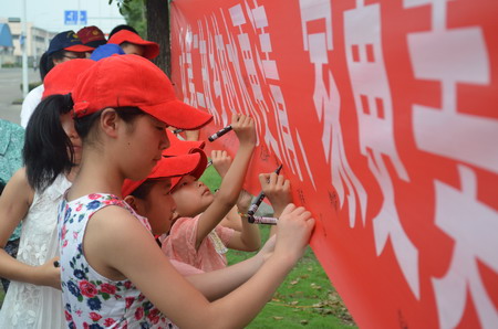 当天上午,艳阳高照。40余名“小候鸟”在老教师志愿者及宁波大学教师教育学院“滴水行动”志愿者的带领下,来到后海塘区域定海河旁。俱乐部负责人李政权老师作动员讲话,她说,水是人类生命的源泉。没有水,人类将无法生存。因此,珍惜、爱护我们人类的生命源泉,是每个公民应尽的义务和责任。俱乐部小班长吴珊同学向小伙伴们发出倡议:从身边做起,积极宣传“五水共治”的重要性;从自己做起,做“五水共治”的小小宣传员和实践者!随后,大家纷纷在“让第二故乡的水更清、家更美”的横幅上签名并庄重宣誓:“治水我行动,节水过暑假”。