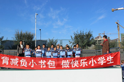 10月13日,房山区北京小学长阳分校的562名在校小学生在升国旗仪式后,每人领到了一个精致的小书包——“减负小书包”。小学生们在领到“减负小书包”的那一刻,兴奋极了!仔细地端量着手中的书包,小心翼翼地挎在肩上,唯恐把新书包弄坏了。