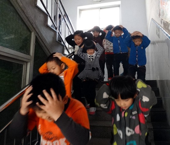 本次演练活动中,各班按学校的规定,两名班主任分别跑在本班队伍的先后,双手抱头,弯腰向前跑,给学生做出示范动作,学生们紧跟老师,不拥挤、不推搡,迅速地冲向指定地点。本次演练中没有出现摔倒、踩踏和推挤等事件,全程用时不到三分钟,效果比较好。虽然是低年级小同学,但他们表现得非常勇敢。