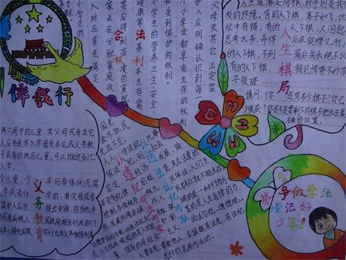 “与法同行”手抄报的制作让孩子们在收集材料的过程中主动学习了与法律有关的知识,提高了法律意识,明确知法、懂法、守法、用法的重要性;同时进一步提高了孩子们的动手能力。