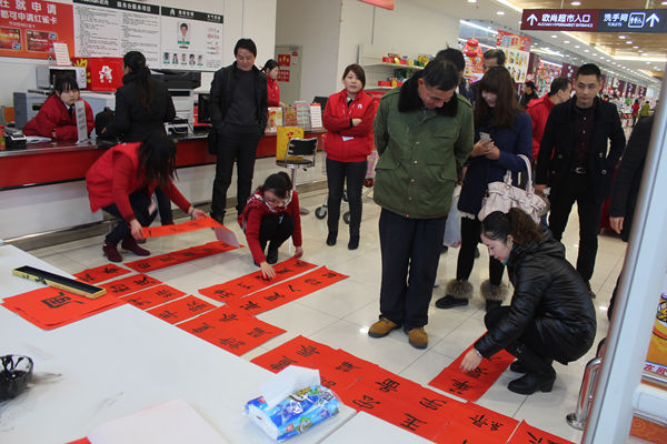 新春佳节来临之际,安徽省安庆市迎江区四照园小学书法工作室的同学们在老师的带领下到安庆市欧尚超市为广大市民们现场书写对联。