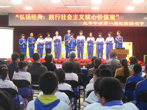 为弘扬国学经典和民族文化,鼓励师生从书的海洋里汲取营养,门头沟区王平中学举办了以“弘扬经典,践行社会主义核心价值观”为主题的第一届校园读书节活动,区教委中教科、区关工委、教师进修学校中学研修中心有关领导及部分语文研修员、学生家长和全校师生参加了活动。