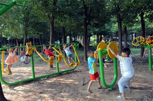 8月31日下午,在安徽省庐江县柯坦镇虎洞村新农村示范村小圩村民组,孩子们在绿树成荫的森杯乐园里尽情地玩耍,享受着童年里的快乐。
