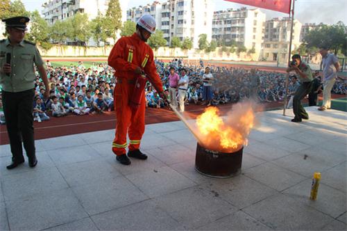 下午4时,活动正式开始。安庆消防支队秦潭湖消防中队队长陈泽瑞结合天津滨海新区塘沽开发区的瑞海国际物流有限公司所属危险品仓库发生爆炸事件介绍了火患的危害,从学生身边的实际述说了火灾易发的原因,并结合防火器材的使用和注意事项告知全体师生如何有效防范火患。演练现场,秦潭湖消防中队消防员点燃汽油火桶,用干粉灭火器进行了实地操作演练,点燃居家常用的灭蚊剂说明消除火患的有效方法,强调“消防重在防,灭火要及时”,同时发现火情要及时拨打“119”火警电话,消防安全教育活动持续了1个小时。