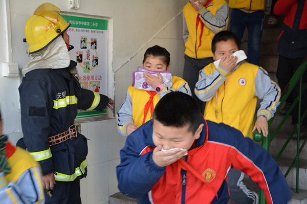 学校充分利用班队会、升旗仪式、板报、班班通媒体、校园广播等不同形式进行宣传,增强学生的安全意识,提高他们的应急避险能力。 3月25日,学校邀请安庆市消防特勤中队的官兵们来校一同开展了校园应急疏散演练。上午8时15分,随着消防车警报声拉响,校园应急疏散演练活动正式开始,在学校领导和班主任老师的统一指挥下,全校学生开始了紧张而有秩序的疏散和撤离。学生们按照事先安排的路线,在教师的带领下分两队快速有序地跑向操场,并保证靠楼梯右侧猫腰、捂口鼻行进。全校1300余名师生,疏散和撤离仅用2分28秒,整个演练过程井然有序、动作迅速,无意外伤害事件的发生。随后,消防战士为全校师生现场展示了“攀爬6米拉梯上二楼解救被困人员”及利用消防车喷水救火的场景;消防员们快速的反应、敏捷的身手,过硬的功夫,令全校师生大开眼界,掌声不断。