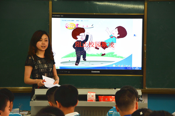 各班班主任通过视频播放揭露“校园欺凌”现象的严重危害,引导学生思考“杜绝校园欺凌”的重要性。随后老师们通过在ppt讲解的过程中,穿插随机提问、生活举例、“拉拉手,我们都是好朋友”等方式,促使学生逐步形成正确的价值观和是非观,建立起平等友好、互助意识。
