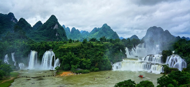 浩浩荡荡的归春河水一路奔涌,到了德天地区突遇断崖横阻,于是滚滚洪流猛然跌宕、冲撞、咆哮、怒吼起来,形成了声势俱壮的大瀑布群。大瀑布群在越南境内的部分名为板约瀑布,在中国境内的部分叫德天大瀑布。